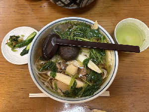 (昼食)ここのはツルッと細いうどん ネギが大きいし、鳥の出汁も効いてる〜😋 喉越し良くて大好き♡