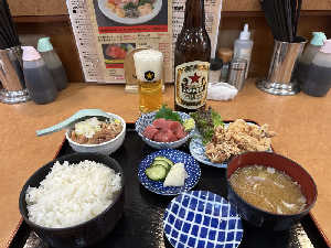 鶏唐揚げ2個、ニラ玉、マグロぶつ付き(ご飯大盛無料)