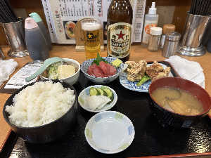 鶏唐揚げ2個、ニラ玉、マグロぶつ付き(ご飯大盛無料)