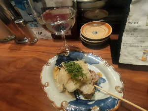食べログ立ち呑み百名店。オシャレ立ち呑み屋で女性客の方が多い😮。ガリを食べる為の豚肉ですね🥰