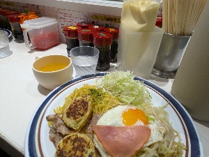 目玉焼き、ハム、豚肉、お好み焼き風の具が入り麺がおかしい量入ってる。これで1人前。