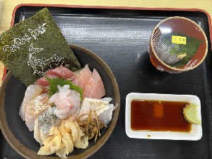 はまち・地元産とれとれ真鯛の乗った堅田丼。平日限定の蕎麦セットは提供遅いし味が微妙なのでいらない。