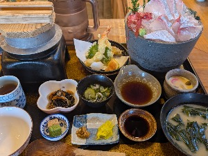 刺身盛の容器が大きすぎていわゆる底上げ式でコスパはそれほどでもない。ご飯、味噌汁、刺身三種に小鉢。