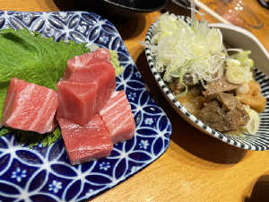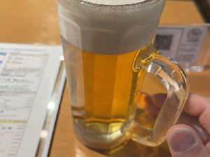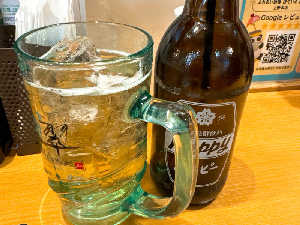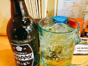 にんにく・ポテトフライ・うずら・牡蠣フライ・たこぶつ他を黒ホッピーで流し込んだ🍺