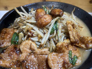 濃いめに味付けされた肉野菜炒めのタレが、ニンニクが効いたパンチのあるスープによく馴染む。旨辛でした。