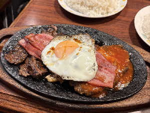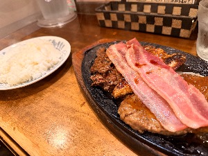 ベーコンの下にはステーキとチキンとハンバーグ。脂身が少なく筋トレと相性よさげ。