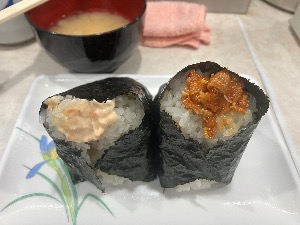 ホッキ貝サラダ焼きたらこ・豚キムチ納豆・生たらこ🍙 1,800円の高級おにぎり😗