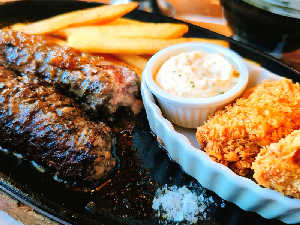 ソースによく合う粗挽きなハンバーグ! サーロインは脂と筋が多めだった ご飯大盛り!