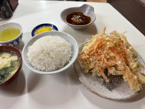 軽い感じの天ぷら、和のファストフードって感じで美味しい!味噌汁熱々、甘くて美味しかったー