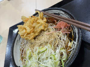 朝のかき揚げ温玉ぶっかけそば。クーポンワカメで大満足だよん。
