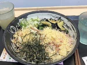 朝のかき揚げ温玉ぶっかけそば。クーポンワカメで大満足だよん。