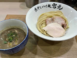 極太の全粒粉モチモチ麺はそのままでも👍。濃厚だが、ほんのり煮干しで、ソフトな味のつけ汁に浸け極美味😋