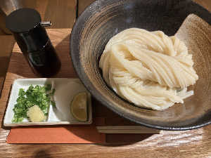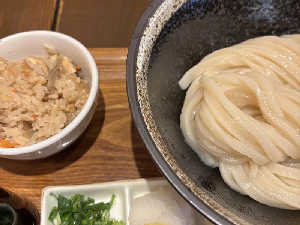 鯛ちくわ天をトッピング。 コシのあるモチモチのうどんは絶品です。