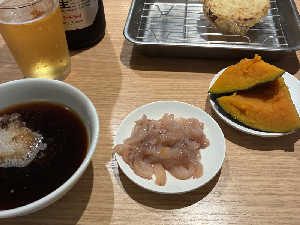 あつあつの天麩羅と絶妙なつけ出汁はベストマッチ。イカの塩辛の柚子が食欲をそそる。紅生姜は微妙。