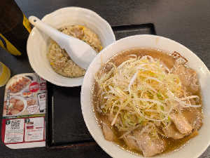 チャーシュー5枚入ってるがこれがノーマル麺。汁は濃い、ミニ丼もチャーシューが濃い。病みつきになる。