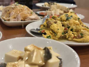 若鳥の唐揚げと玉子のチリソース炒め 冷奴と杏仁豆腐付き😊