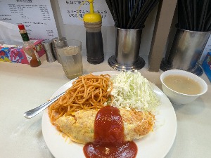 行列に惹きつけられて並んで食べた。具がゼロのオムライスとスパゲッティ。