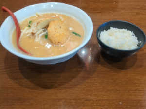 普通、味噌カレー牛乳ラーメンだよね。コロッケかと思ったらマグロメンチ、リンゴものってる。