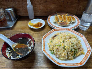 パラパラではない卵とチャーシューたっぷりのベチャタイプ。餃子は酢コショウ+辛子で。やっぱりうまい