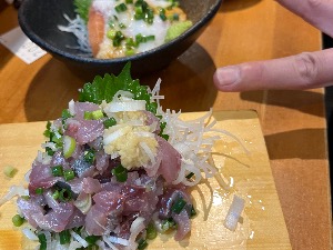 鮮魚系の立呑屋、ふっくらとしたさつま揚げはハーフ¥200 チラリと見える刺身は八角とカンパチ