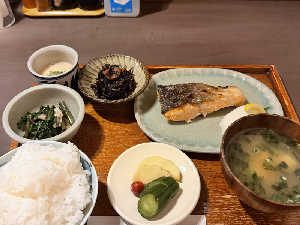 しゃけが良い塩加減。ご飯、お味噌汁お代わり自由。旨し。