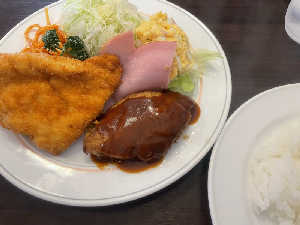 先輩にご馳走になりました。とんかつ、ハンバーグ、エビの玉子包みで大満足の定食です。