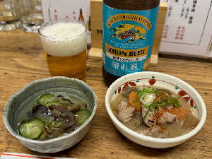 味噌どて煮カキ🦪、味噌どて煮牛ホルモン🐃、おばんざい各種、黒生ビール🍺、熱燗🍶