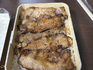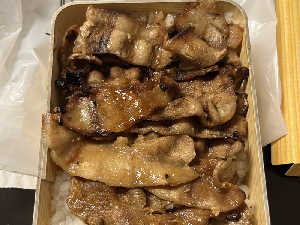 香ばしく焼かれた豚とご飯だけのシンプル弁当。ボリューム満点で、ご飯の底までタレが染み込んでいて美味。