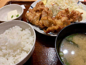 灼かれた分は、肉食べないと回復❤️🩹しない。イカのから揚げ、貝汁もウマシ!