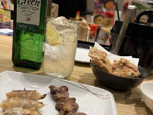 塩味の効いた美味しい焼鳥を食べて炭酸の効いたサッパリ鏡月で流し込む☺️🍺幸せ〜☺️🍺