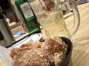 揚げたて熱々の唐揚げと炭酸が効いたさっぱり鏡月🍺美味しい❗️😋