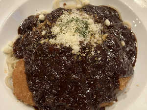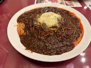 サ飯にパスタか〜と思うなかれ 甘めのミートソースとヘビーカツはサ飯としての役割を果たしている!