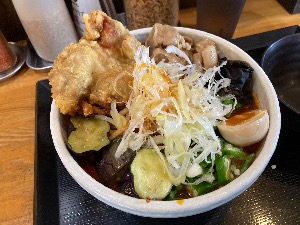 肉そばに唐揚げinってわんぱくすぎでしょ🍖