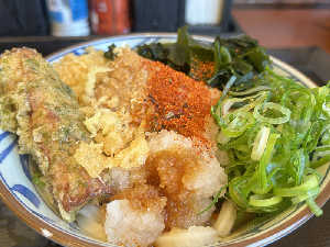 かしわ、野菜かき揚げ、いなり、明太子をトッピング。😋