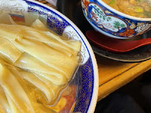 ちぢれ太麺。ワンタンみたいな麺も。バランスがよく上品。
