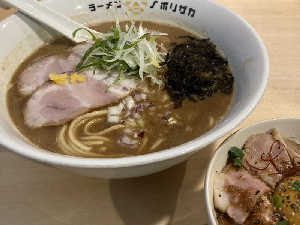 濃いめのスープ美味しかった〜 チラッと見えているのはレアチャーシュー丼(300円)