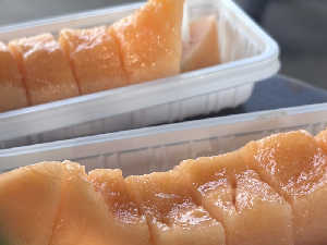 青肉メロンと赤肉メロンのミックスソフトクリームにメロンをトッピングしたメロンづくし‼️