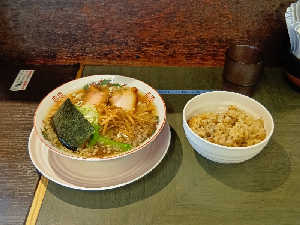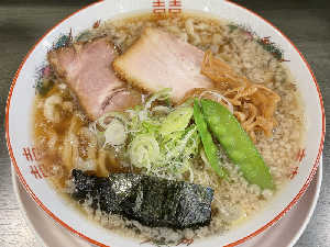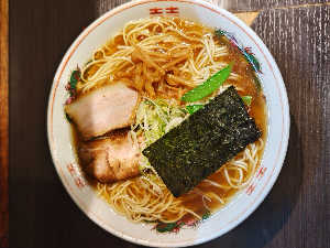 朝ラーメン。あごダシのさっぱり、でもコクもしっかりあるスープ。手もみの太ちぢれ麺が良く絡む。満足。