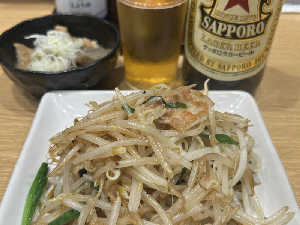 『サウナ+ビール』→京橋はいいところ。山盛りもやし炒めをおかわりしました。