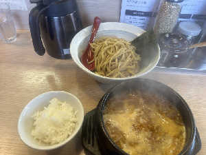 今日のランチです。 ぐつぐつのつけ麺スープがたまりません。