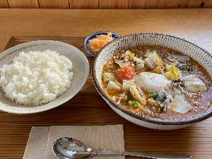 辛さ30、温玉、鶏なんこつ、白菜のスパイスオイルソテートッピング+たまねぎのアチャールで1,600円