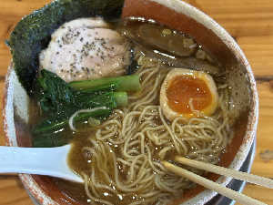 美味ラーメン。動物系と魚介系と野菜系のミックススープ、中細ストレートがよく合う。店半分の空間が面白い