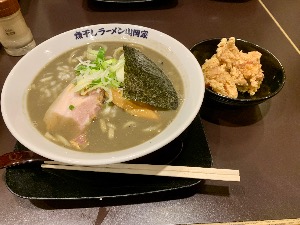 クーポンで薬味ネギ、チャーシュー、海苔追加 お供に半ライス、唐揚げ3個