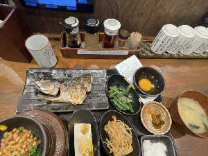 生卵、納豆、冷奴、大根きんぱら、インゲン胡麻和えトッピング。安い、美味い、早い!