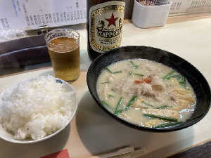 赤星🍺を飲みながら、鳥モツ、鯛アラ、鰹を頂きます😋 そして〆のぶた汁とご飯🍚 やっぱりめちゃ美味い😋