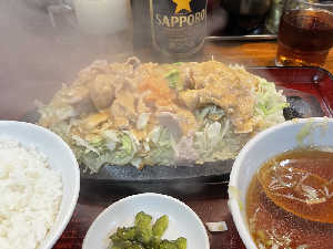 学生受けよさそうな鉄板肉野菜炒め。 普通に美味しいけど、もうひとパンチほしい感じ。