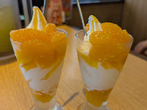 ねぎ肉そば味玉トッピングとたっぷりみかんパフェ