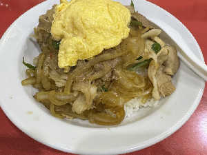 玉ねぎ、ピーマン、豚肉等を美味しさと高さで表現した丼