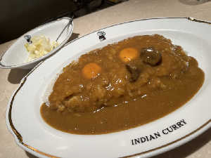 懐かしい甘さから、激辛へと変化するカレー。 卵を割ってピクルスも混ぜて食べるのが最高に美味しい。
