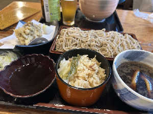舞茸の天ぷら・しめじご飯・せいろ(鴨)のセット 美味し😋